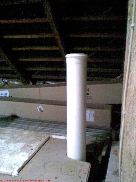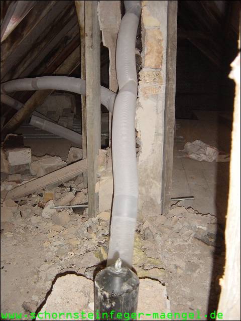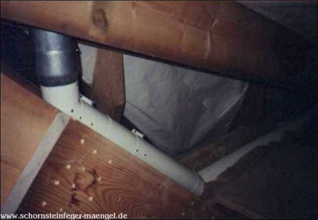 Abgasleitung frei, undicht, ohne jeden Halt und im Dachboden mit einem