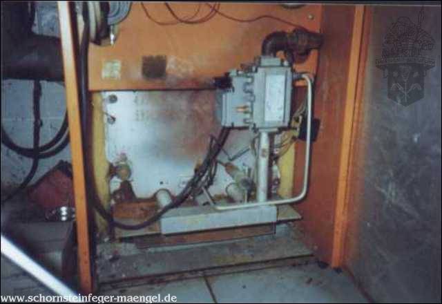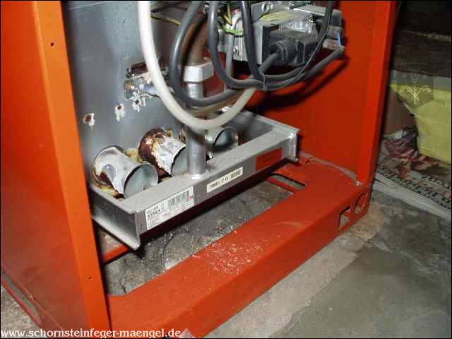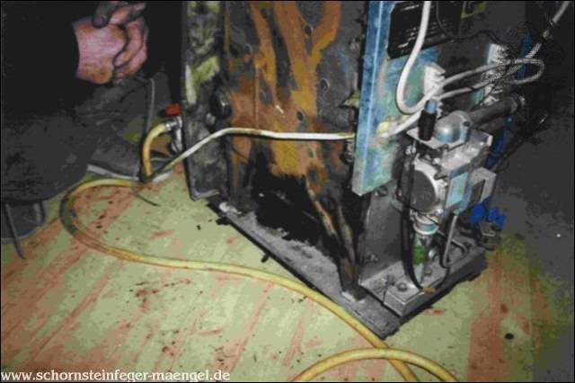 stark verschmutzter Brenner mit Abgasaustritt und Kohlenmonoxydausstoß